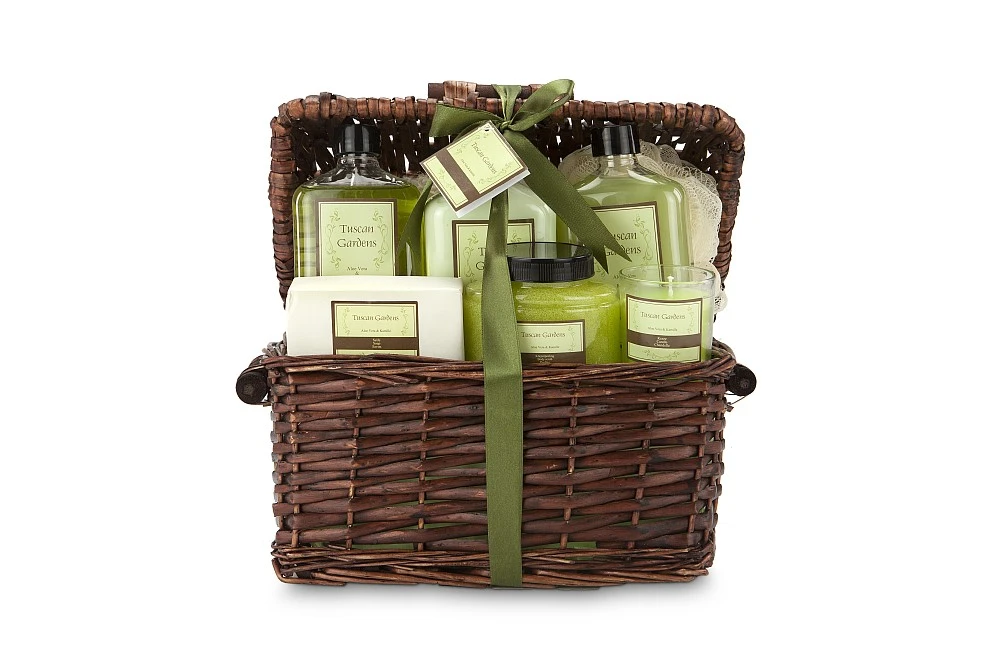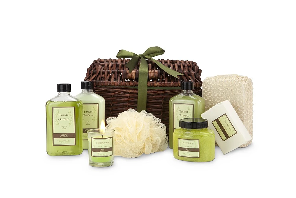 Das Geschenk-Set „Arezzo“ entführt Sie zu einem traumhaften Wellness-Erlebnis in die Toskana: je 255 ml Duschgel, Bodylotion, Schaumbad, eine Kerze, 220 g Badesalz, 100 g Seife und je ein Sisal- und Mesh-Schwamm werden Sie verwöhnen. Der herrliche Duft der Badezusätze nach Aloe Vera und Kamille komplettiert das Badeerlebnis und garantiert Entspannung pur! Das XXL Geschenkset kommt ansprechend verpackt in einem hochwertigen Weidenkorb.