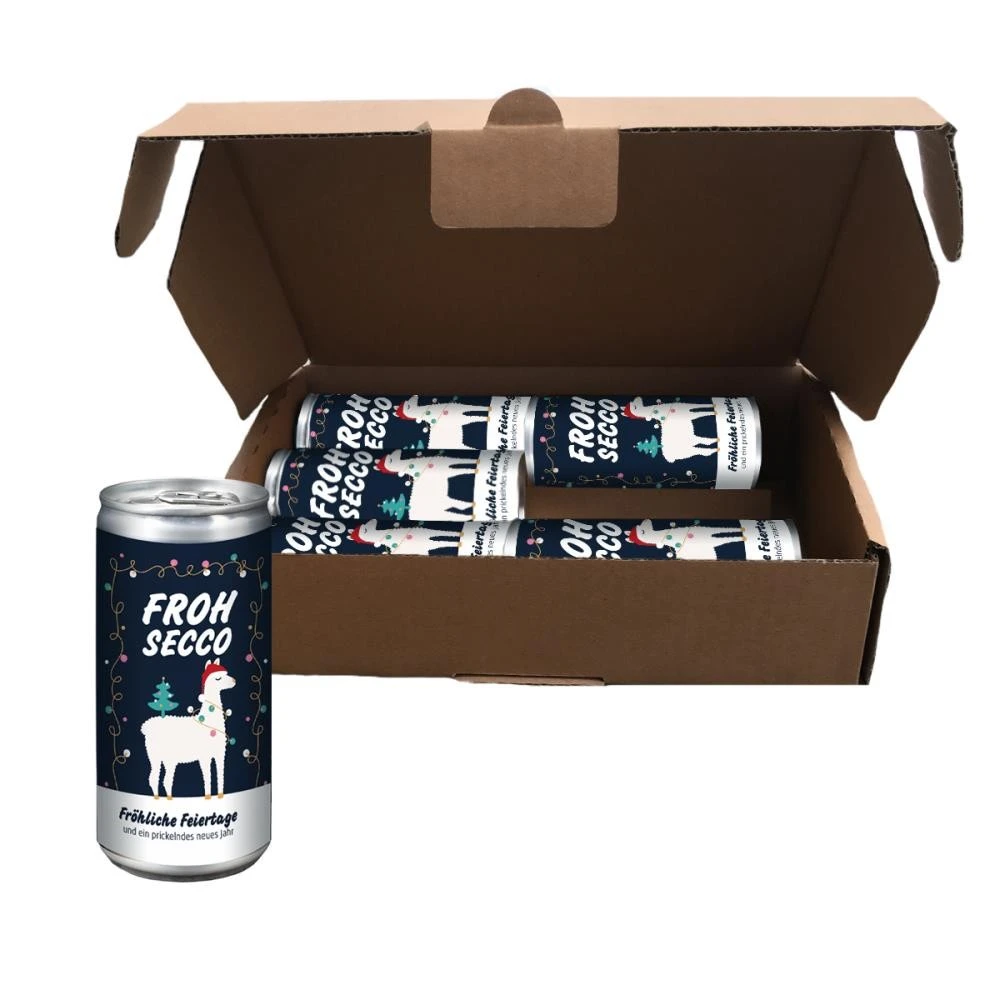 Mit „FrohSecco“ verschenkst Du 6 Mal einzigartig prickelnde Weihnachtsfreude. Der Secco in der 200 ml Dose ist eine weihnachtlich sympathische Aufmerksamkeit für Mitarbeiter, Kunden und Geschäftspartner.