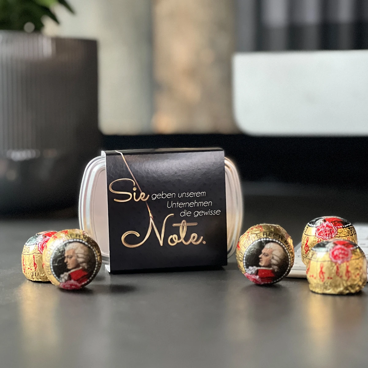 Dann haben wir das ideale Präsent für Dich. Unsere hochwertige Geschenkdose, gefüllt mit fünf köstlichen Mozartkugeln, bietet nicht nur einen Gaumenschmaus, sondern auch eine liebevolle und wertschätzende Botschaft: „Sie geben unserem Unternehmen die gewisse Note“. Die stilvolle Geschenkdose kann von Deinem Mitarbeiter wiederverwendet werden und erinnert ihn so jeden Tag aufs Neue an die Wertschätzung, die Du ihm entgegen bringst.