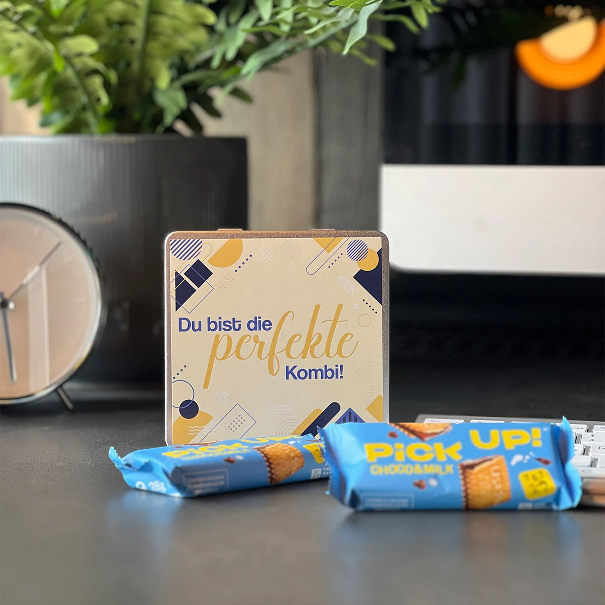 Das kennen wir doch alle: ein Lob oder eine Anerkennung und wir wachsen förmlich über uns hinaus, geben motiviert noch mehr Gas und kommen auf die besten Ideen. So wirst Du es auch erleben mit diesem Präsent. Unsere hochwertige Metalldose ist gefüllt mit dem beliebten Bahlsen Keks-Sandwich Pick-Up und kommuniziert „Du bist die perfekte Kombi“. Knackiger kann man wohl kaum ausdrücken, wie stolz und dankbar man für ein tolles Team und jeden einzelnen Mitarbeiter ist.