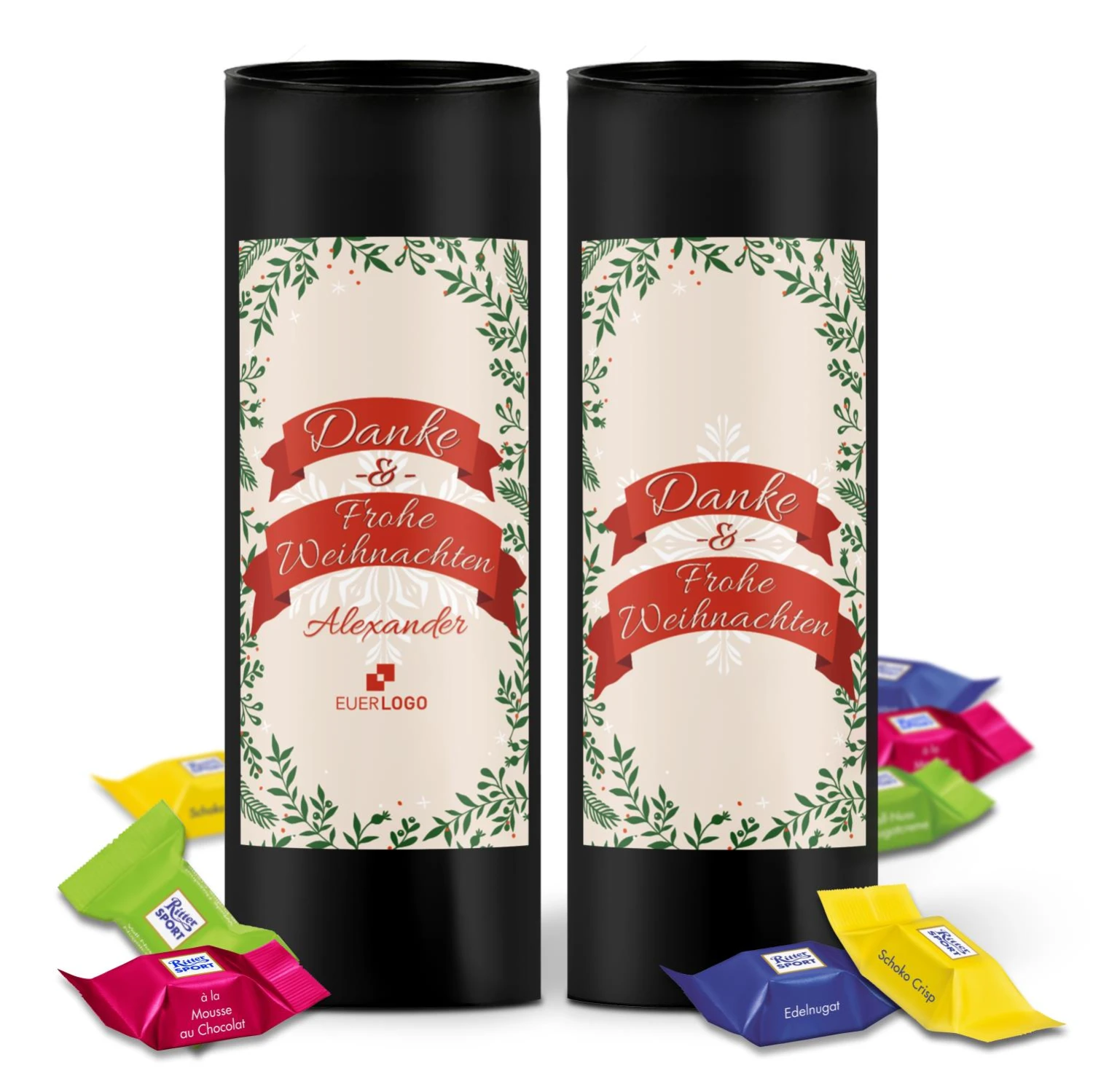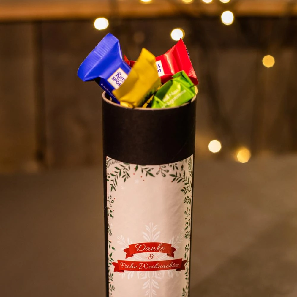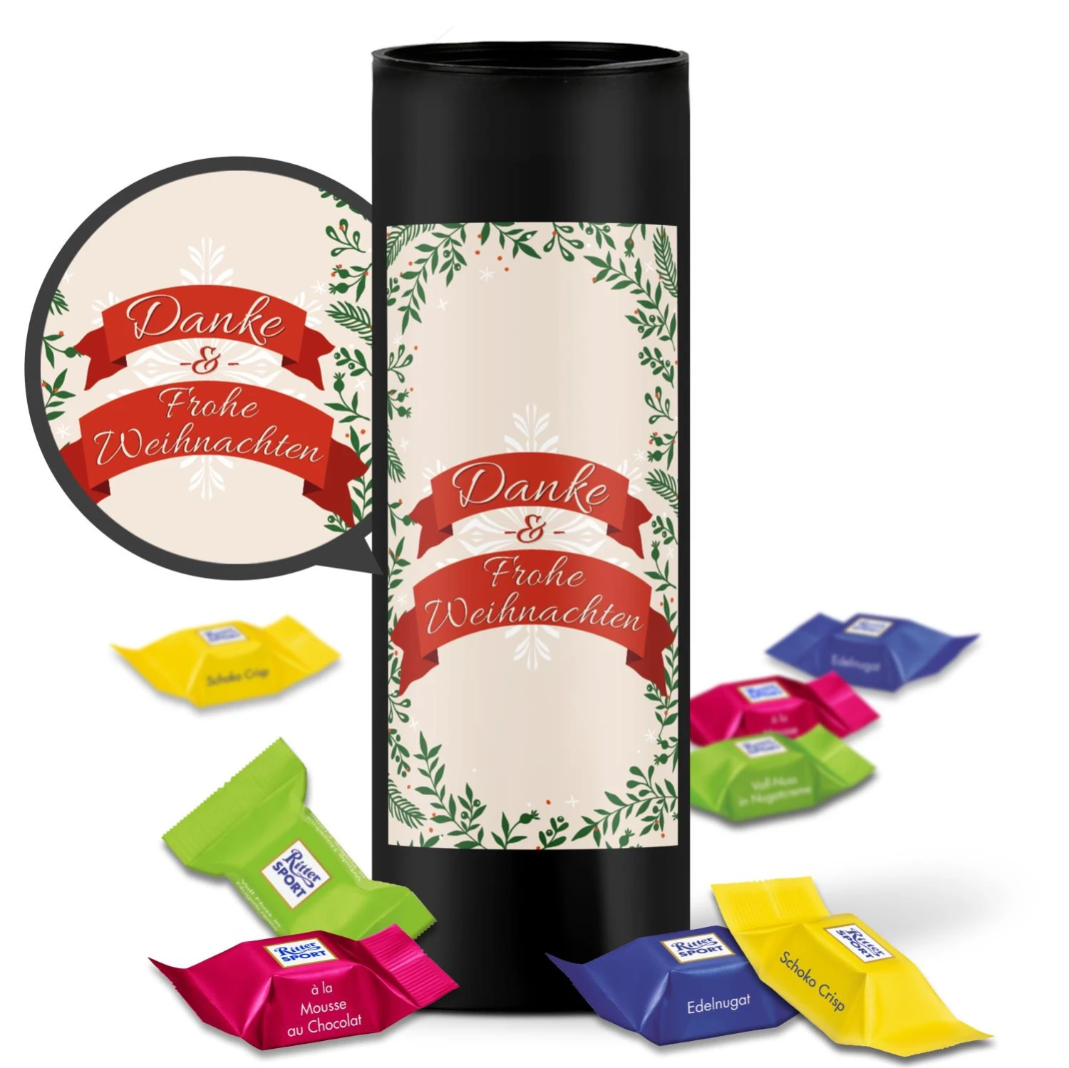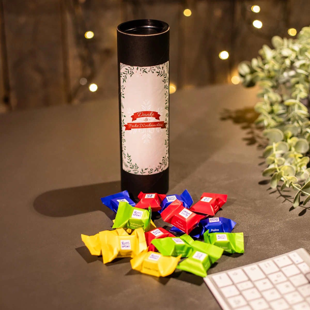Ein bunter Mix aus 16 Ritter Sport Würfeln verpackt in einer edlen mattschwarzen Geschenkhülse mit Design-Etikett und der Aussage „Danke & Frohe Weihnachten“ bringt es geschmackvoll auf den Punkt. Eine Aufmerksamkeit für Deine Mitarbeiter und Kunden, die sie noch lange in Erinnerung behalten werden.
