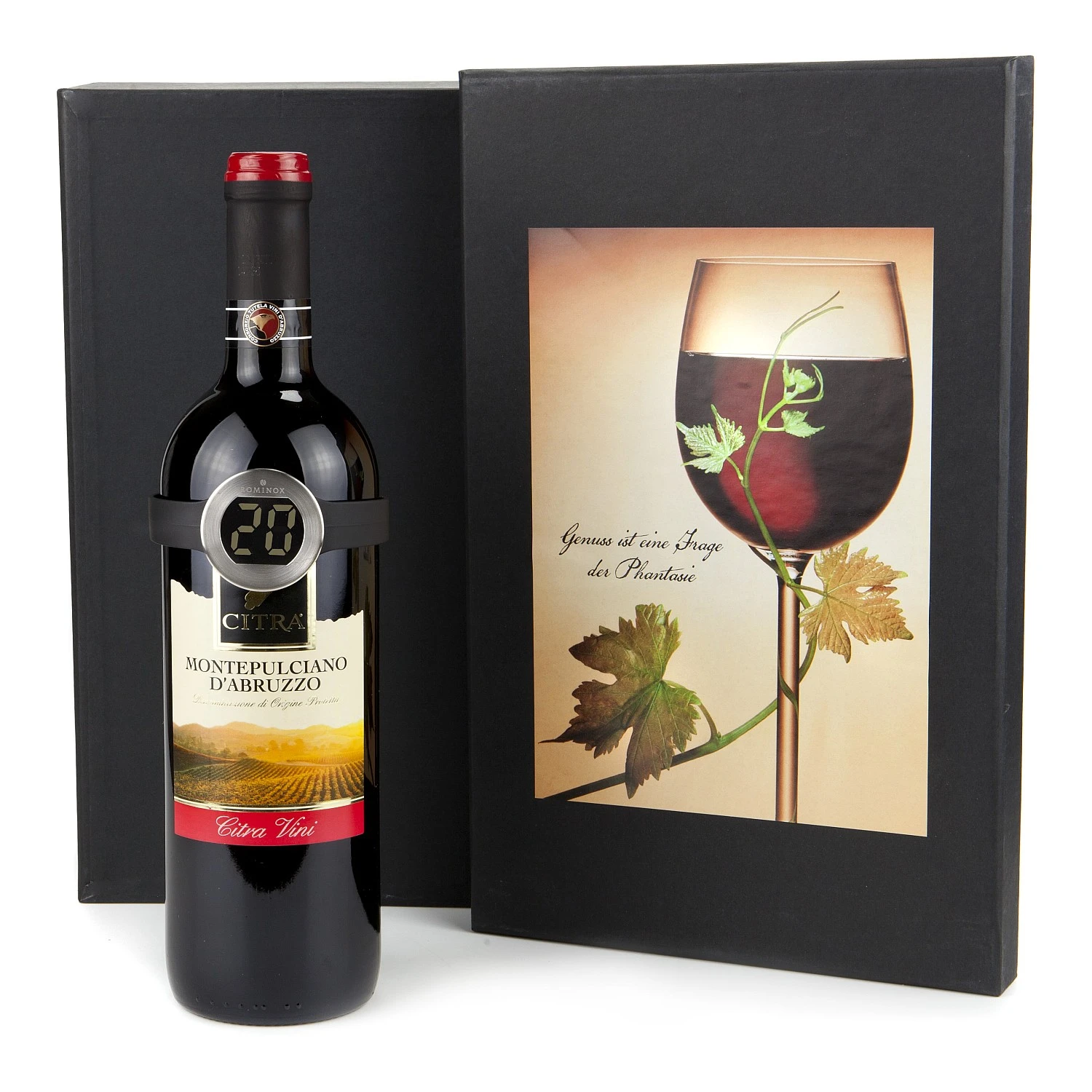 Elegant und mit Stil! Dieses moderne ROMINOX® Weinthermometer zeigt in Sekundenschnelle die Weintemperatur an – einfach um die Flasche klemmen. Das Set enthält neben dem Thermometer eine Flasche Montepulciano d‘Abruzzo (0,75 l). In schwarzem Geschenkkarton mit stilvollem Deckelaufkleber.