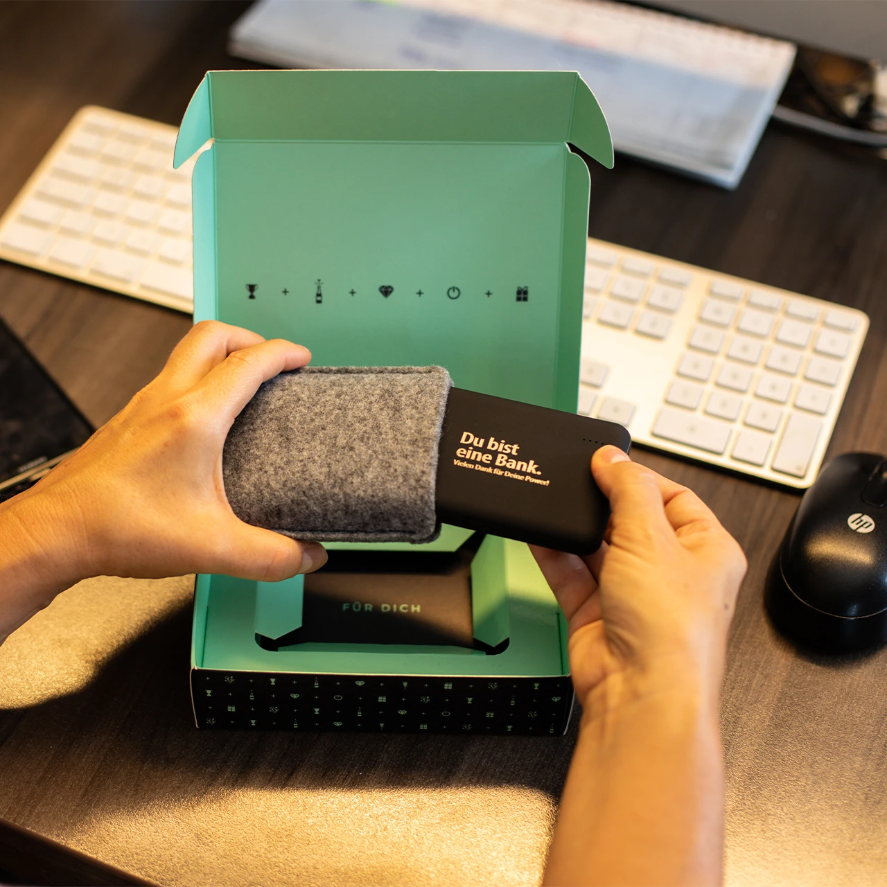 Deine Mitarbeiter haben das ganze Jahr gepowert? Dann kommt hier das perfekte Dankeschön! Mit der ultrasoften Powerbank gibst Du Deinem Team ein bisschen Energie wieder zurück. Und zwar immer genau dann, wenn Smartphones oder Tablets leer sind und gerade keine Steckdose in der Nähe ist. Das Ladewunder hat zusätzlich eine vierstufige Ladestandsanzeige auf der Vorderseite und präsentiert sich in einer wunderschönen nachhaltigen Filztasche mit praktischer Stecktasche. Diese Powerbank ist mit einem Print „Du bist eine Bank. Vielen Dank für Deine Power!“ veredelt und erinnert Deine Mitarbeiter jederzeit daran, wie dankbar Du für ihre Power bist. Nutze auch unseren praktischen Logistik-Service: Wir lagern für Euch und schicken pünktlich zum besonderen Tag nach Hause oder ins Unternehmen.