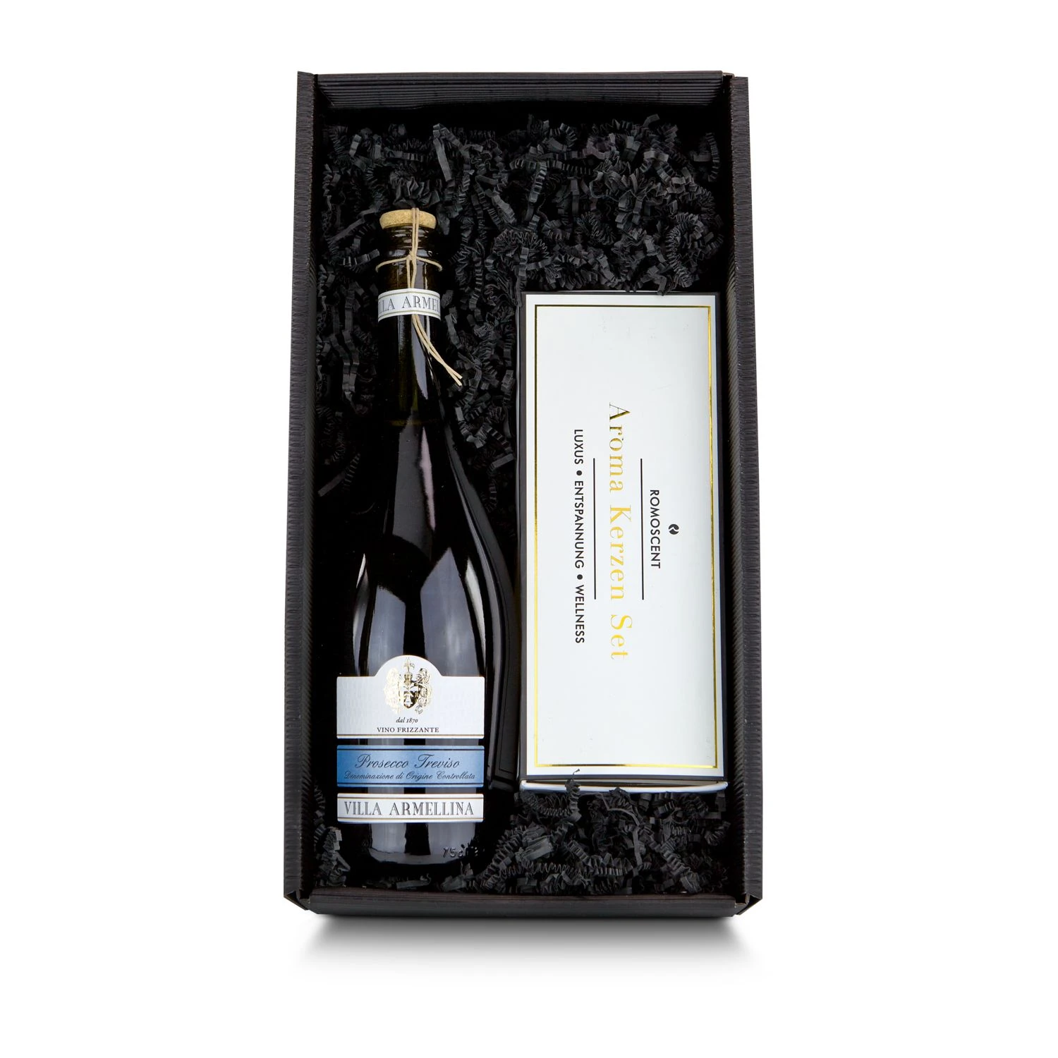 Eine besonders edle Kombination für einen privaten Zen-Moment zu Hause. Entspannen Sie bei einem Glas Prosecco und Kerzenschein. Dafür enthält der schwarze Geschenkkarton mit Sichtfenster 1 Vino Bianco Frizzante (Prosecco DOC Di Treviso, 0,75 l) und ein Aromakerzen-Set mit 3 angenehm nach Vanille duftenden Kerzen. Die edlen Kerzen sind mit einer Schleife versehen und kommen jeweils in einem weißen Glas mit goldenem Aufdruck.