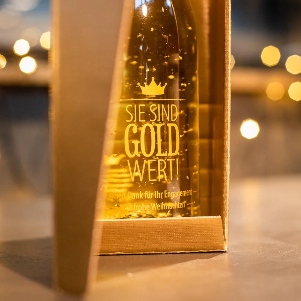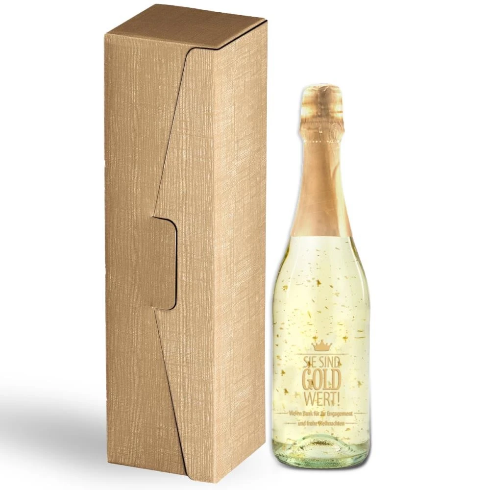 Besser kann man nicht zum Ausdruck bringen, wie wertvoll Deine Mitarbeiter und Kunden für Dein Unternehmen sind. Lebensmittelechtes Blattgold wirbelt in diesem feinen Riesling-Sekt (0,75 l) und sorgt sowohl in der Flasche als auch im Glas für hochkarätige Highlights. Stilecht verpackt in einer schönen Kartonage ist diese Wertschätzung immer goldrichtig. Wir verleihen Deinem Gruß gerne das gewisse Etwas und drucken auf Wunsch den Namen Deiner Beschenkten und Dein Firmenlogo auf den beiliegenden Einleger. Nutze auch unseren praktischen Logistik-Service: Wir lagern für Euch und schicken pünktlich zum besonderen Tag nach Hause oder ins Unternehmen.