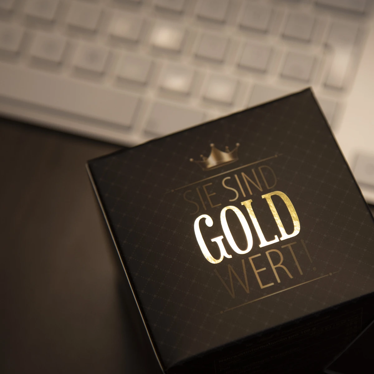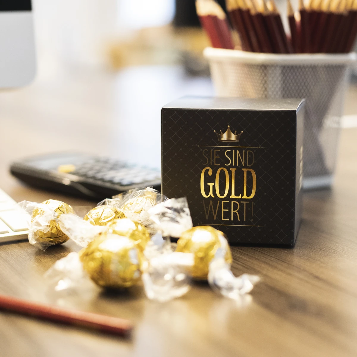 - Aufdruck: „Sie sind gold wert – Vielen Dank für Dein Engagement und frohe Festtage“