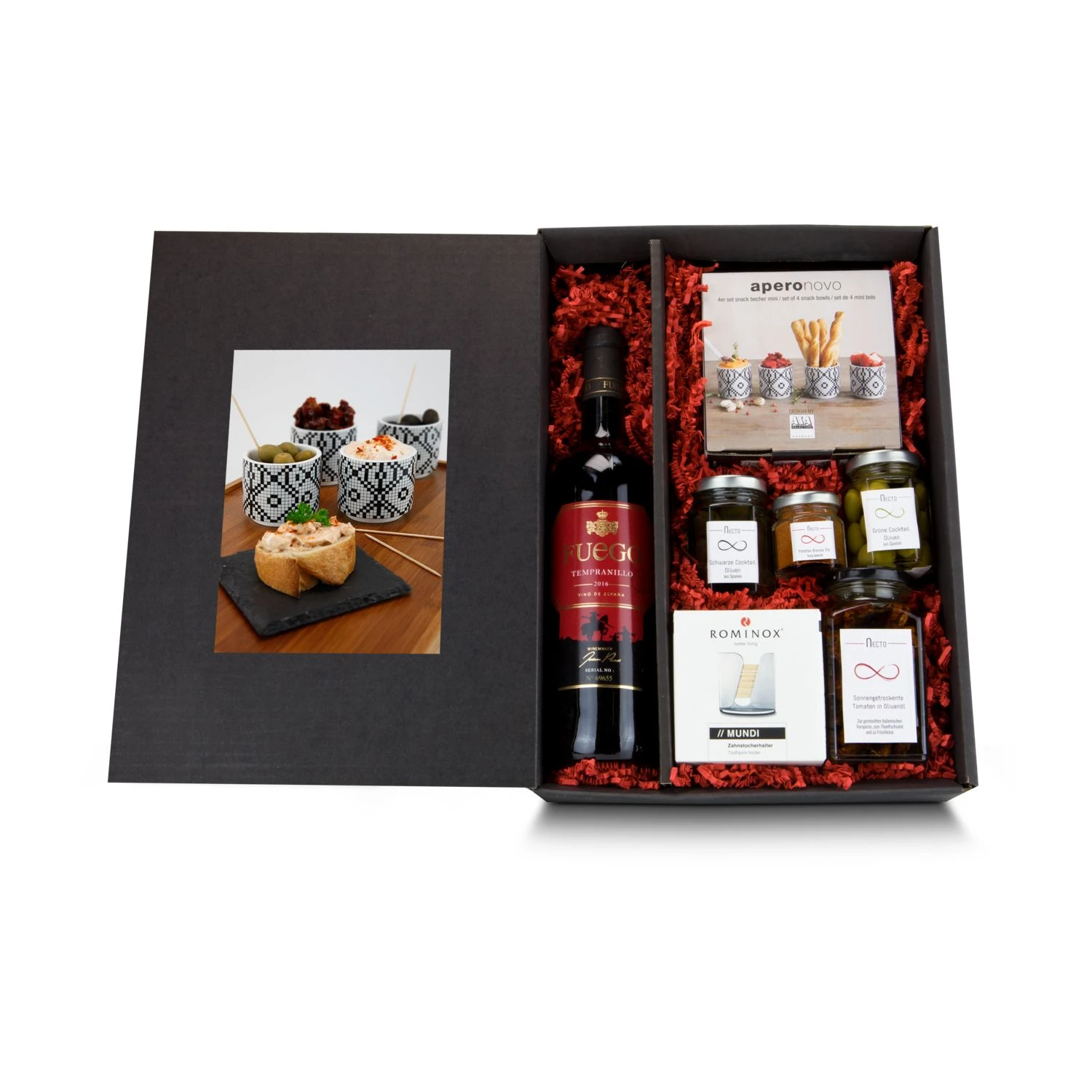 Viva la Vida! Wer diese Geschenkbox öffnet, wird direkt nach Spanien auf eine Tapas Reise entführt. Probiere grüne und schwarze Oliven (je ein Glas mit ca. 50 g, ohne Steine), getrocknete Tomaten (ca. 270 g) sowie den beliebten Patatas Bravas Dip (Gewürzmischung mit ca. 25 g) und genieße dazu einen fruchtig-kräftigen Tempranillo (0,75 l). Die Tapas können mit dem modernen ROMINOX® Mini-Snack-Becher-Set direkt ansprechend zum Rotwein serviert werden. 4 passende Olivenspieße werden mitgeliefert.