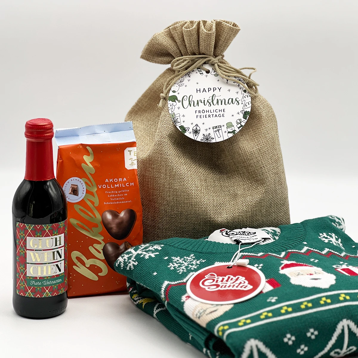| Material: | 1x Weihnachtspullover, 1x Glühwein (0,25l), 1x Bahlsen Akora Vollmilch Lebkuchenherzen (150g), 1x naturfarbenes Jutesäckchen, 1x Hangtag |