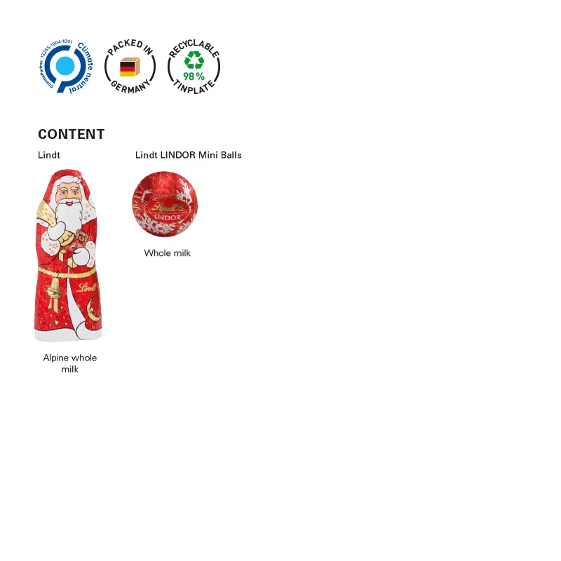 | Inhalt: | Ein Schoko Weihnachtsmann der Marke Lindt aus feiner Alpenvollmilchschokolade, 10 g und zwei Lindor Mini Kugeln à 4,5 g Saisonartikel – solange der Vorrat reicht! |