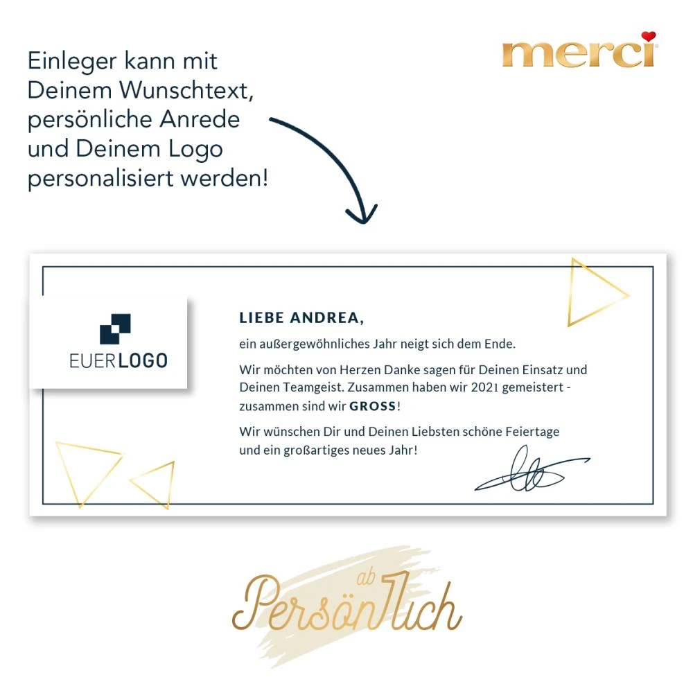 • Dieses hochwertige Geschenkset enthält eine Auswahl an feinsten Merci-Schokoladen, verpackt in einer festlichen und stilvollen Box.